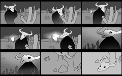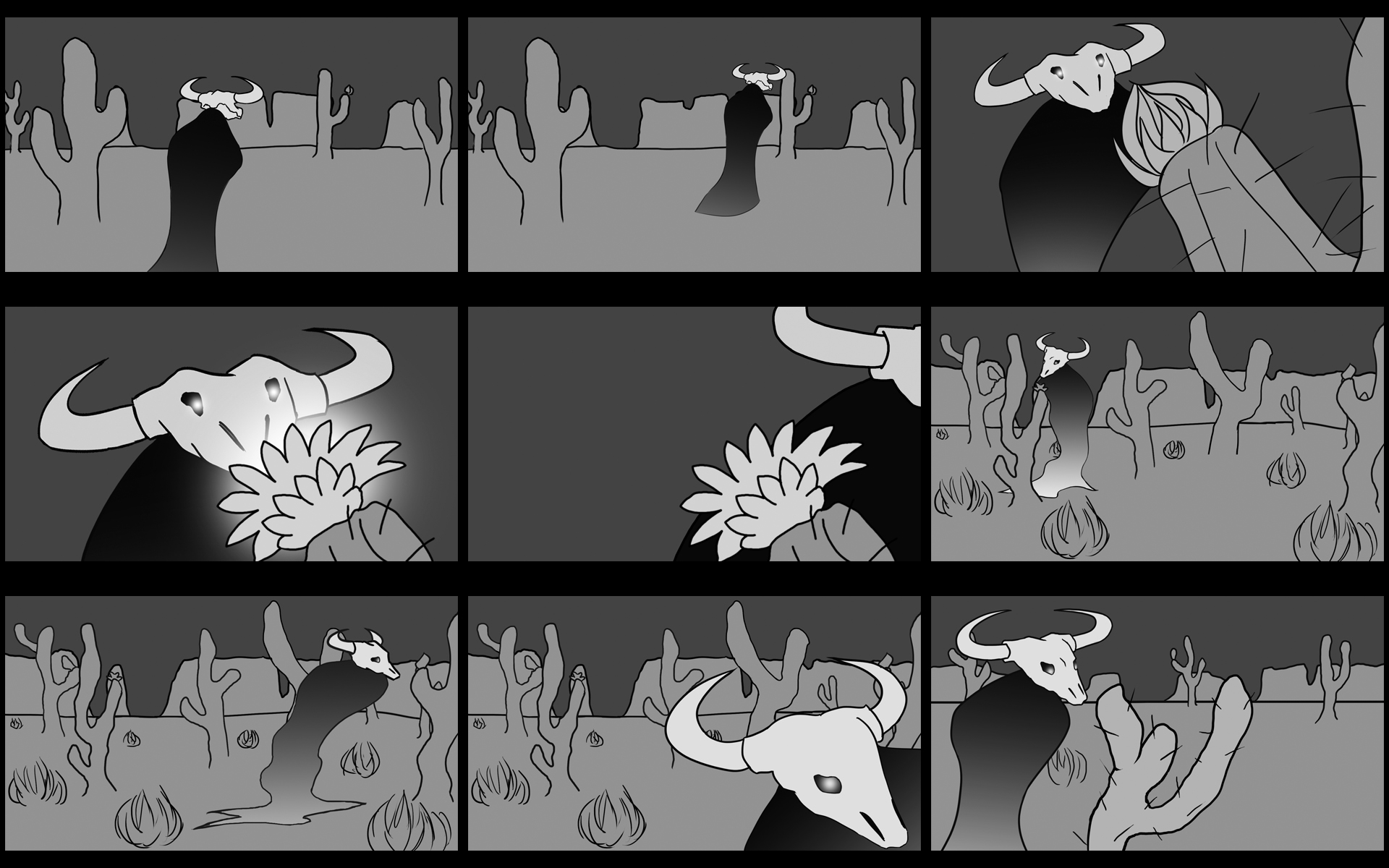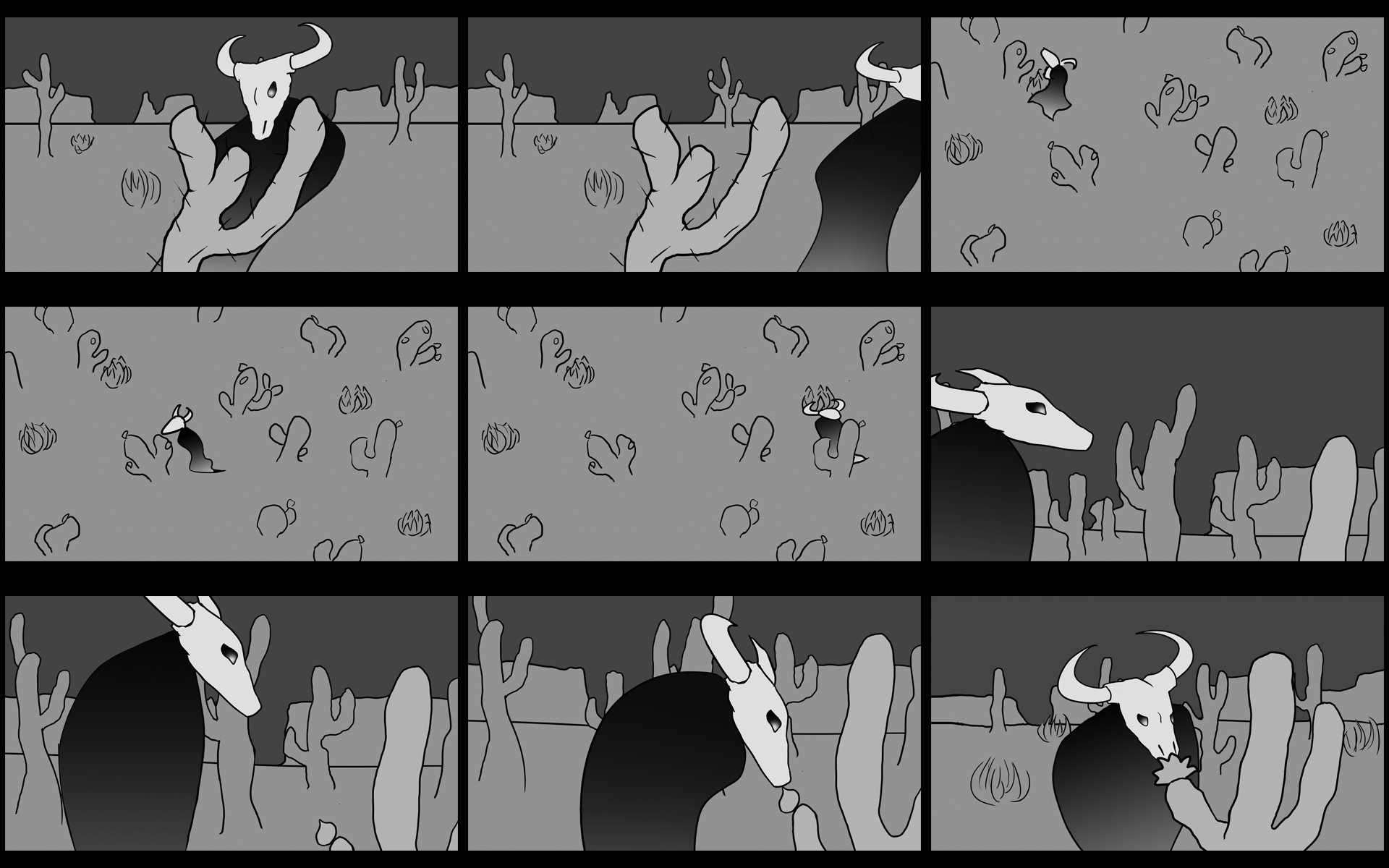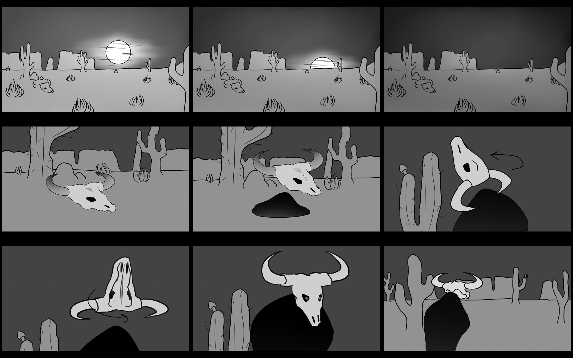 I did the character animation, character concepting, storyboarding, modeling for the skull, sound design, and rigging.